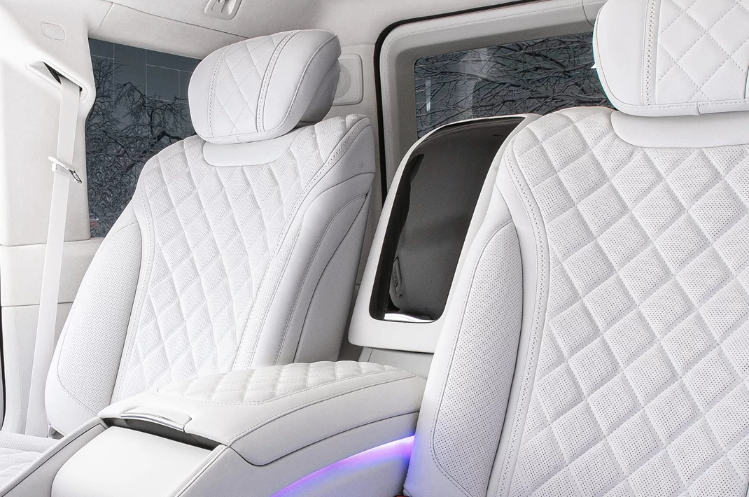 Установка раздельных кресел Mercedes-Maybach с центральной консолью, с подголовниками, с электро-регулировкой сидений, функцией подогрева и вентиляции. Диван оборудован трехточечными ремнями безопасности. Управление происходит с оригинальных джойстиков, интегрированных в борта.