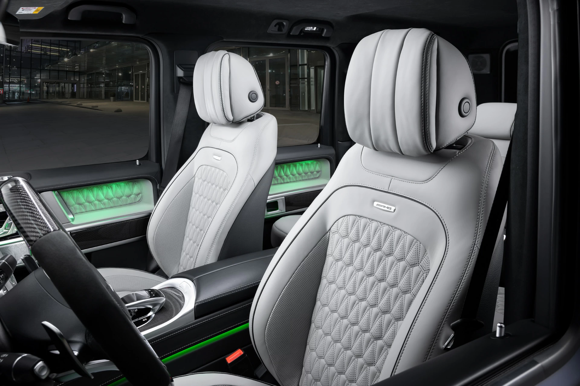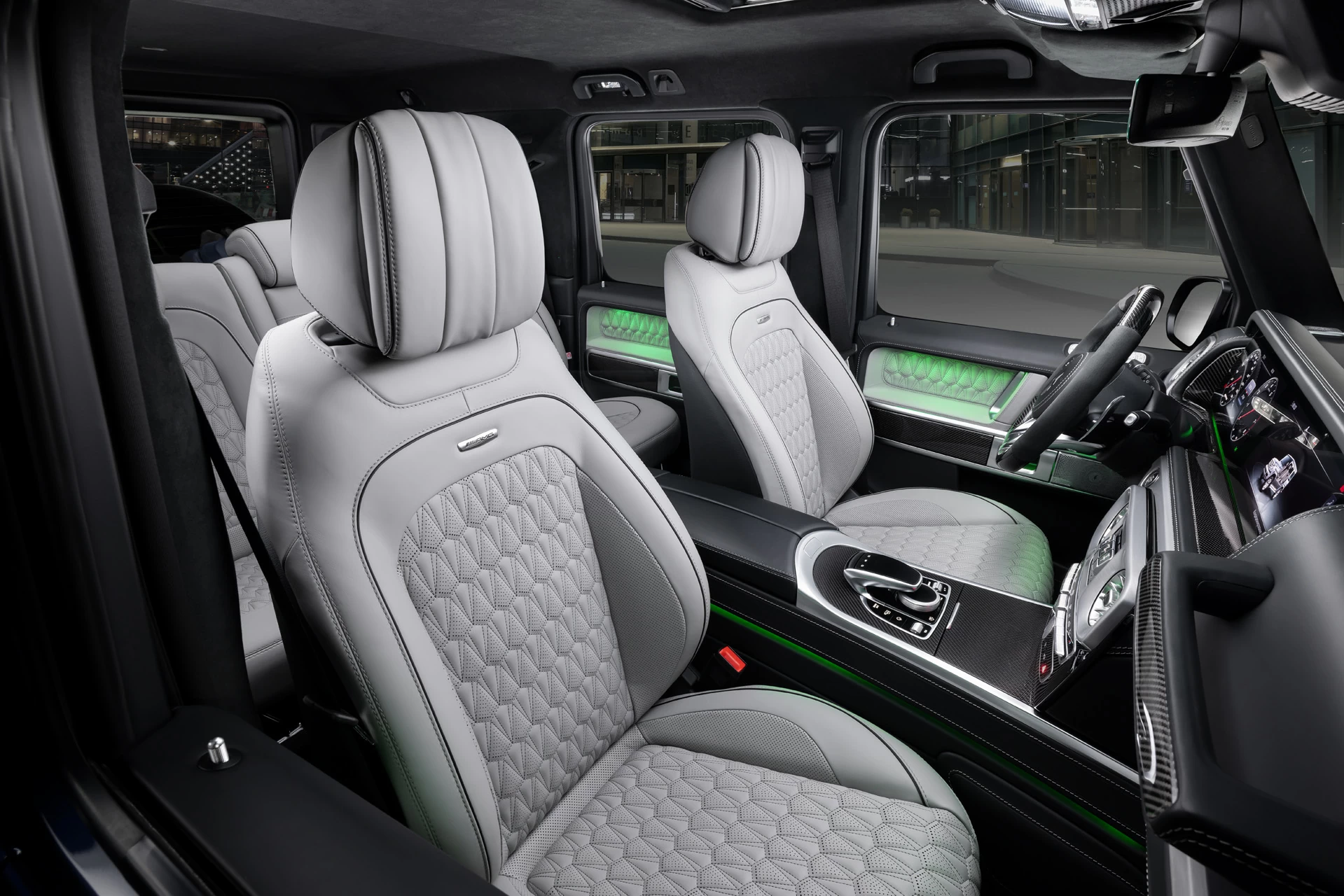 Создание эксклюзивного интерьера для внедорожника включало тщательный подбор материалов и деталей, чтобы подчеркнуть уникальность и премиальность G-Class. Карбон в интерьере добавляет не только эстетическую привлекательность, но и функциональность, обеспечивая легкость и прочность конструкций.