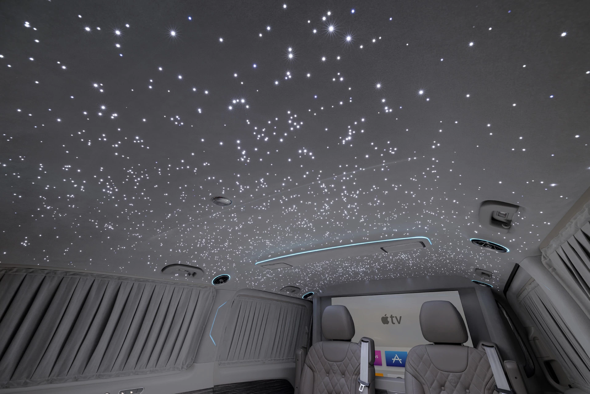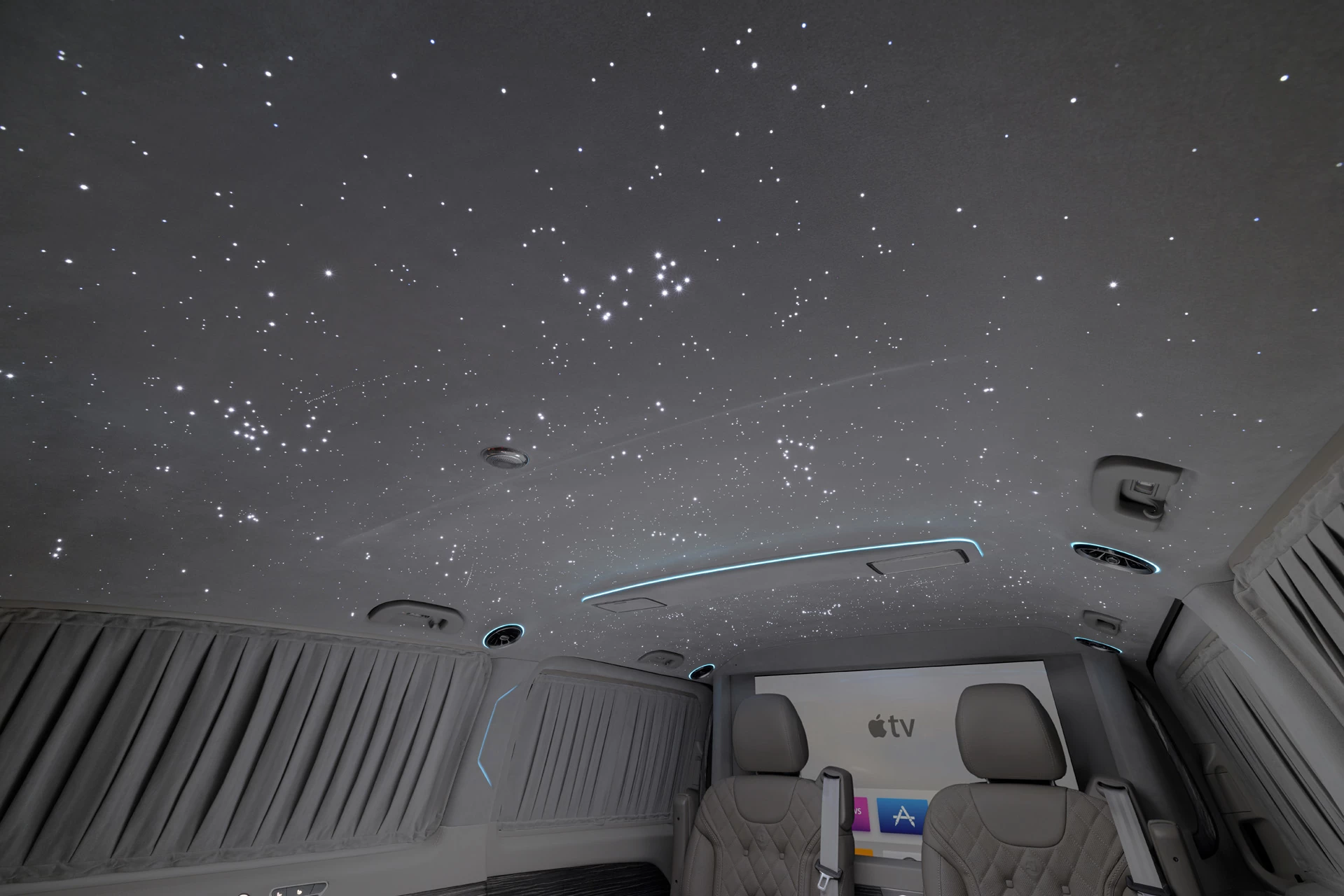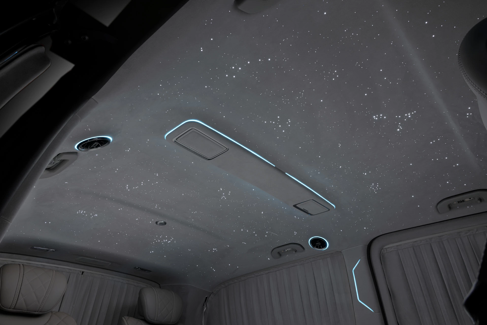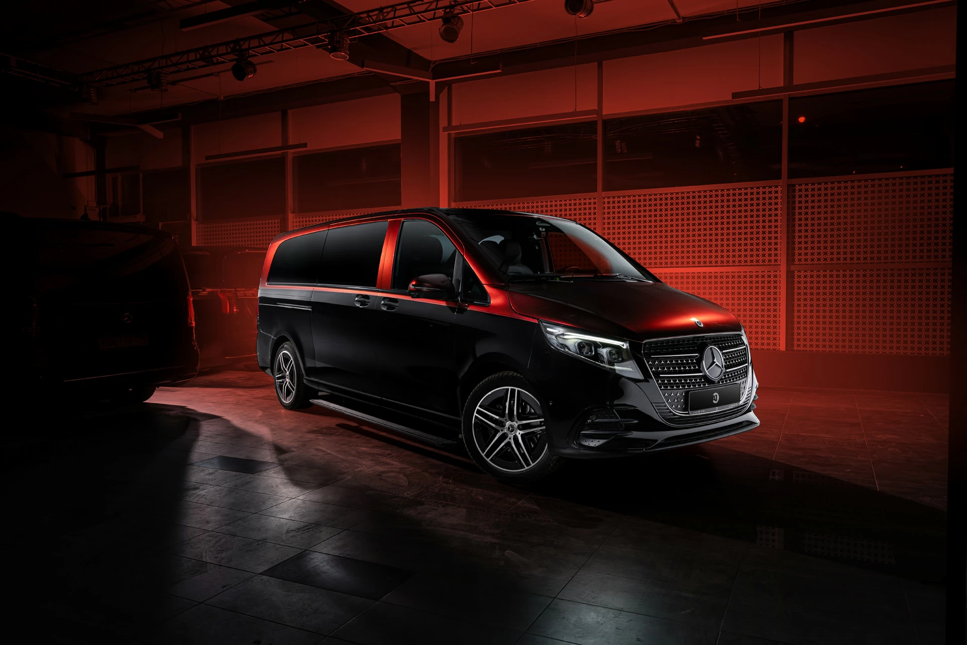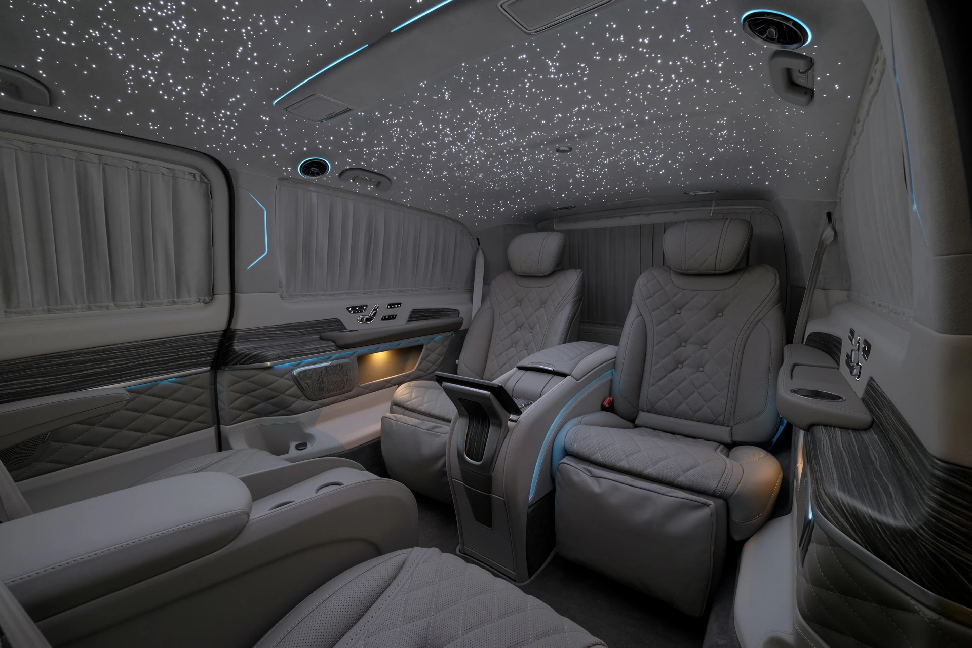 Особенности V-BusinessJet включают систему "Звёздное небо", создающую атмосферу уюта и релаксации. Двухцветный кузов подчеркивает элегантность и современный дизайн автомобиля.