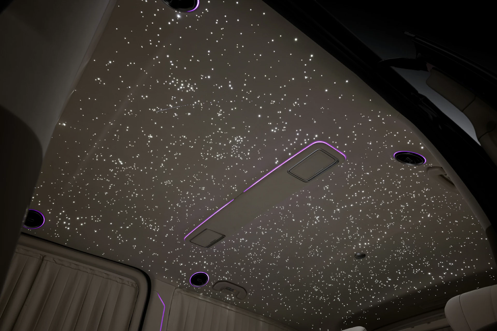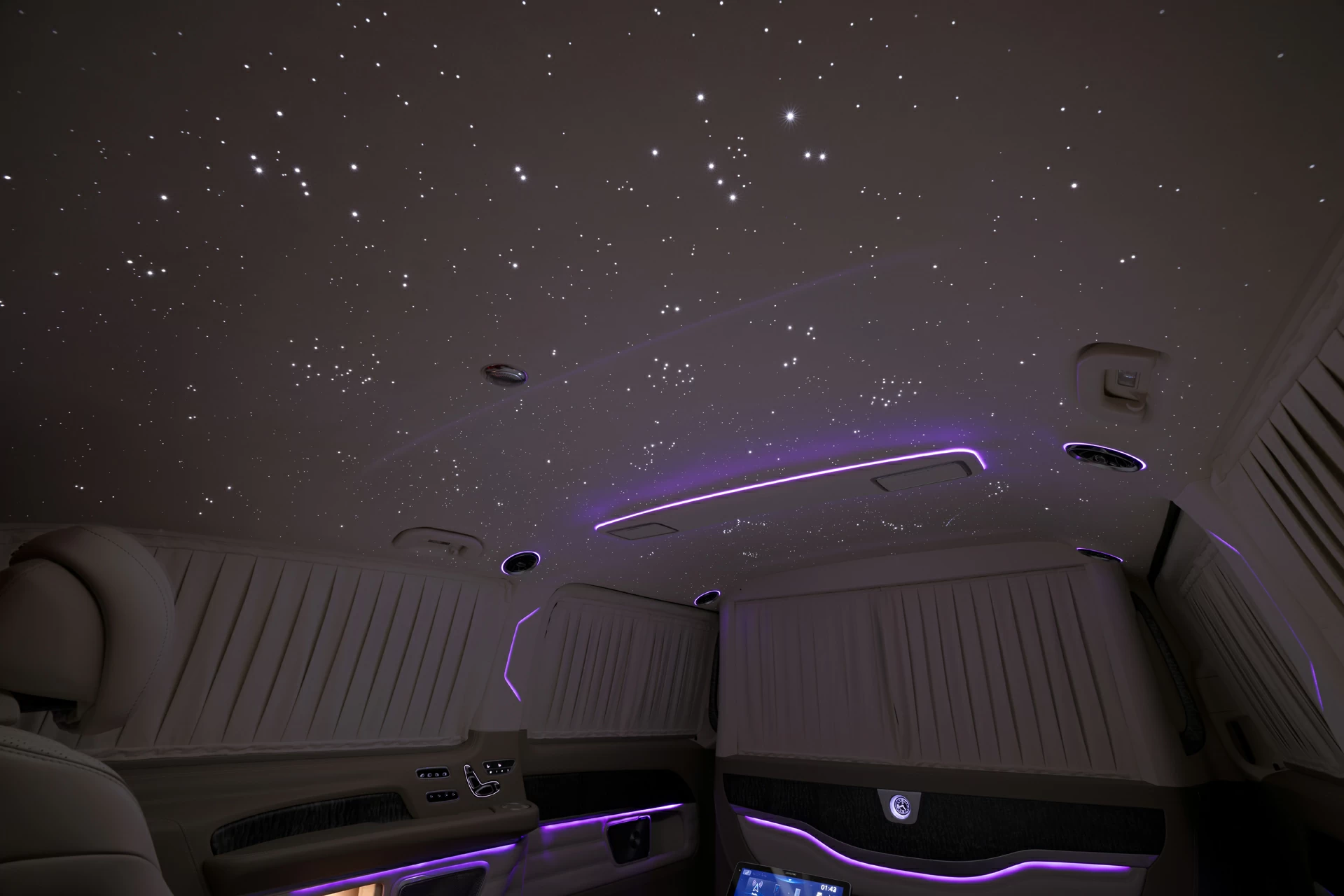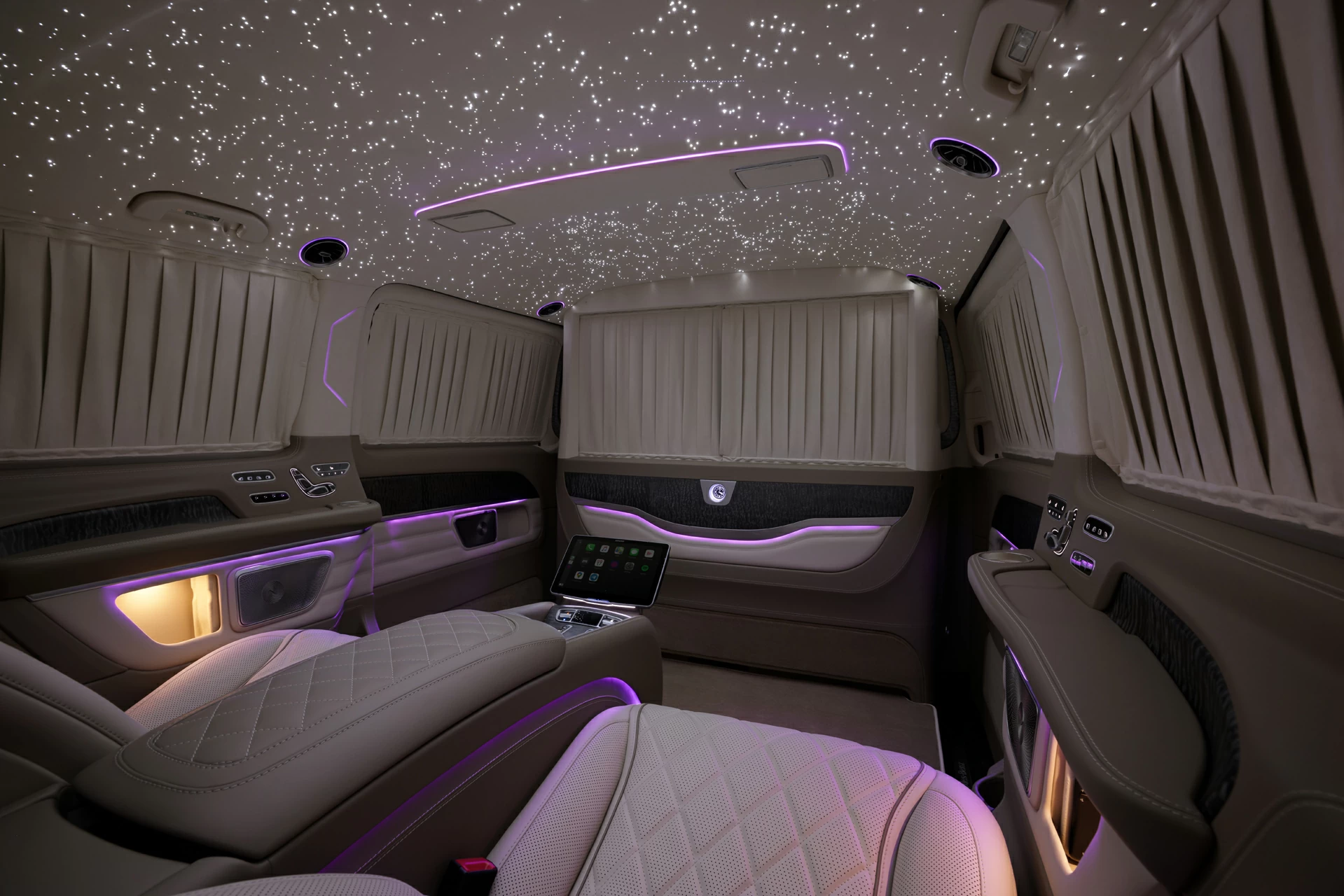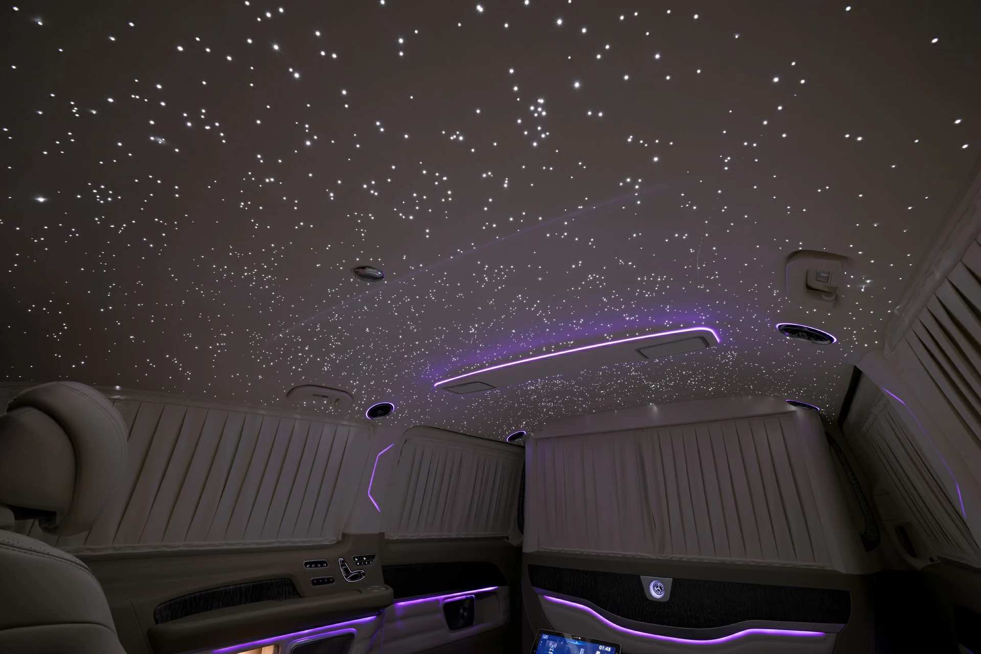 Mercedes-Benz V-Class 300D V-BusinessJet — бизнес-класс внутри минивэна. Этот проект — воплощение философии А1 АВТО: создавать интерьеры, которые по уровню исполнения и атмосфере соответствуют частным бизнес-джетам. Комплектация V-BusinessJet — одна из флагманских разработок компании для Mercedes-Benz V-Class. В основе проекта — бежевый интерьер, выполненный вручную из премиальных натуральных материалов. Потолок украшен «звёздным небом» с эффектом мерцания и динамическими элементами — настоящая визуальная доминанта интерьера. Отдельное внимание заслуживает межсалонная перегородка, оснащённая встроенным монитором, акустикой и системой управления комфортом.