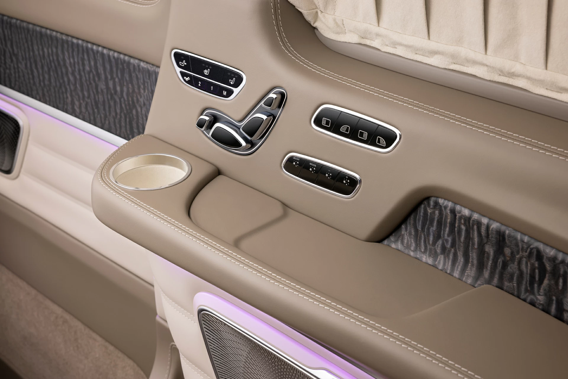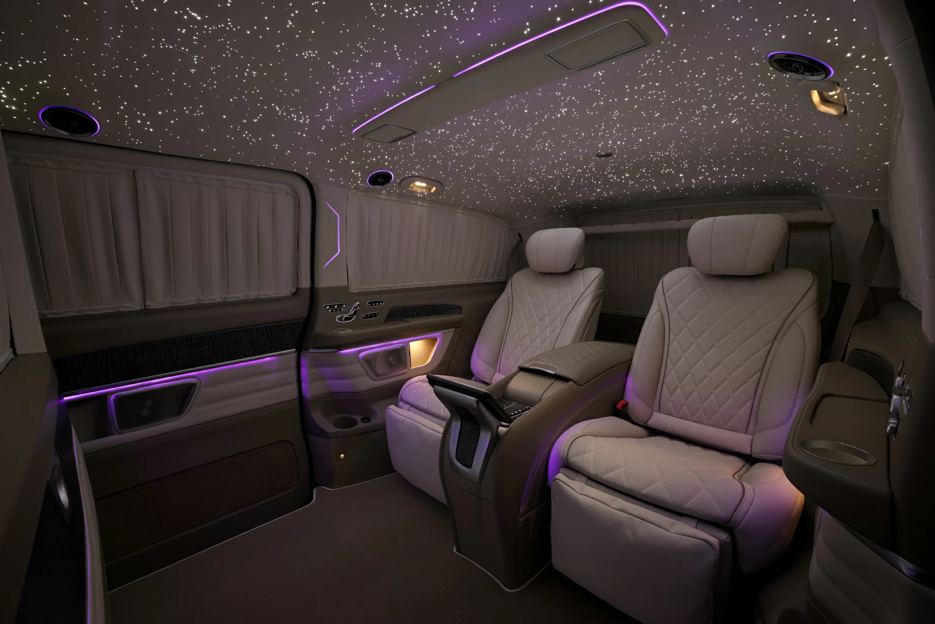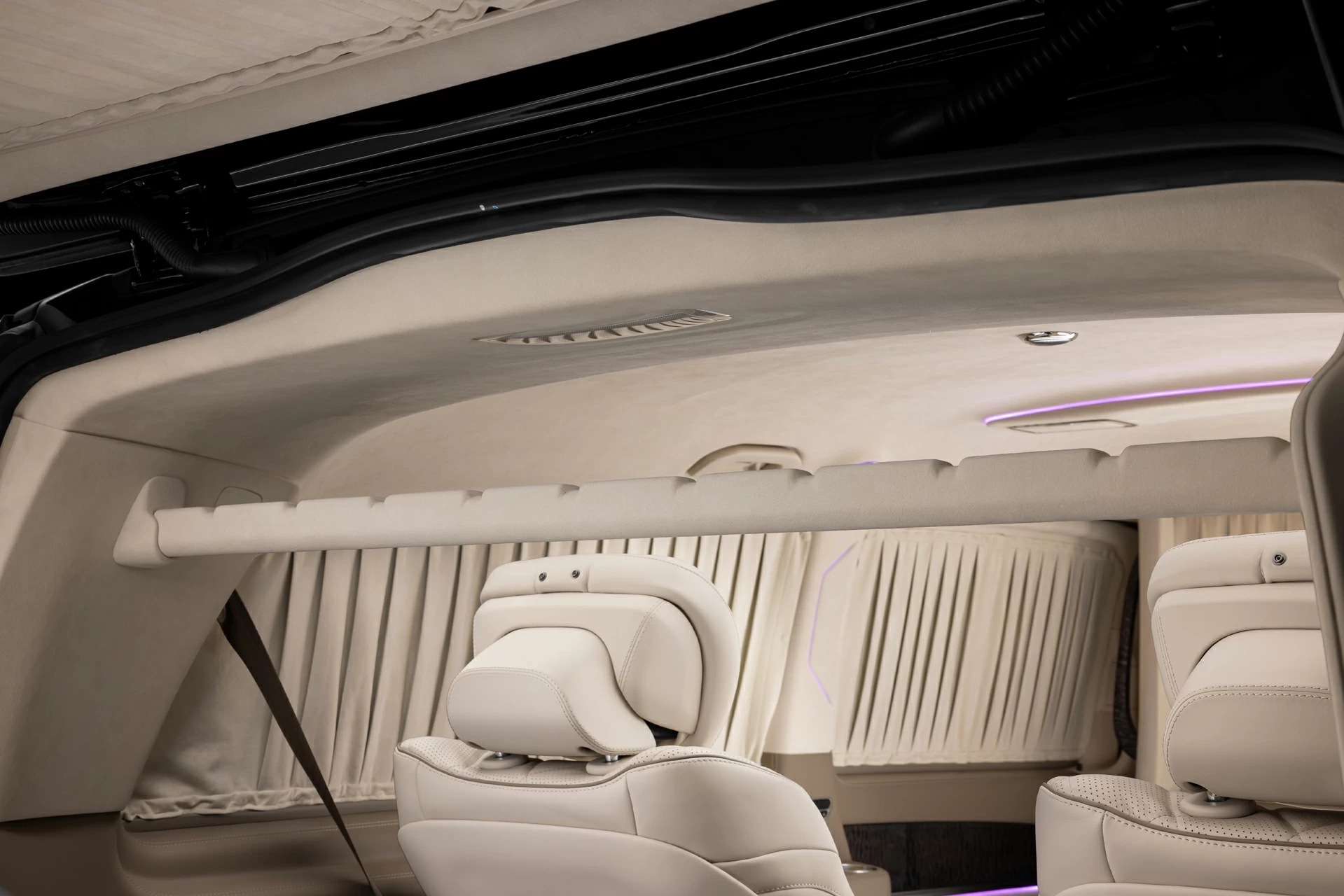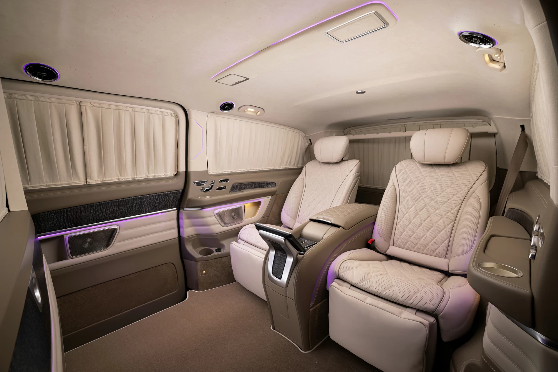 Раздельный посадочный узел с креслами Mercedes-Maybach обеспечивает максимальный комфорт при длительных поездках, а каждая деталь — от декоративных вставок до контурной подсветки — продумана с учётом эстетики и функциональности. V-BusinessJet — не просто эксклюзивный интерьер для микроавтобуса. Это статусное пространство, где каждая поездка превращается в опыт премиального уровня.