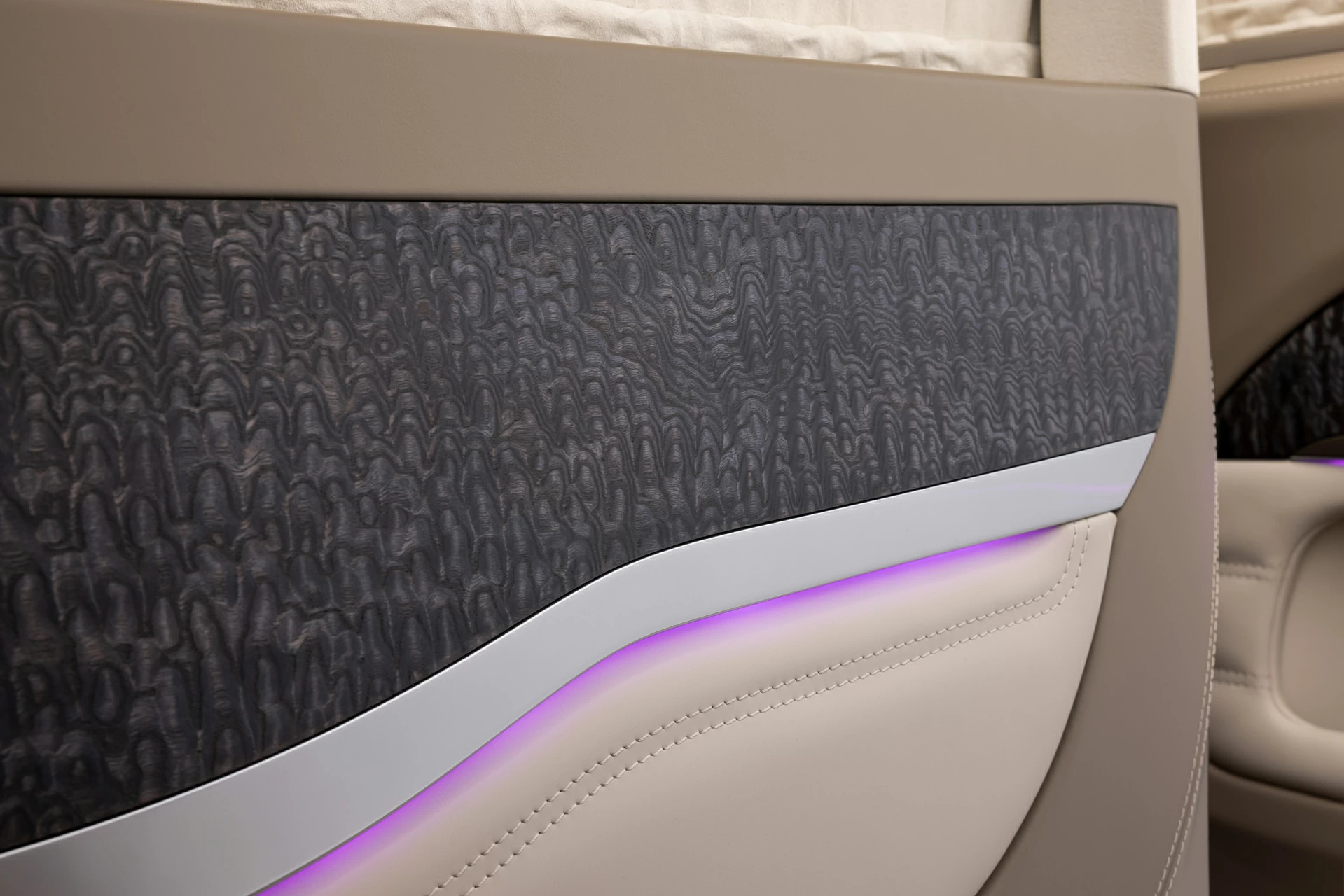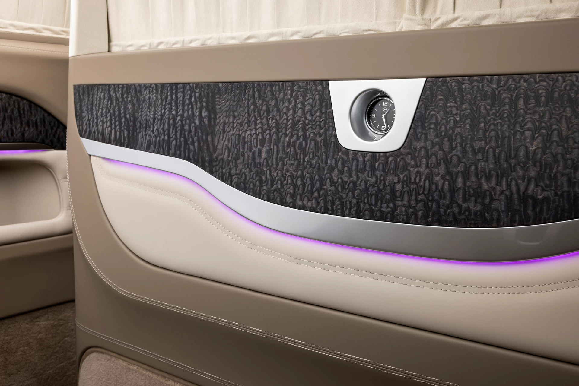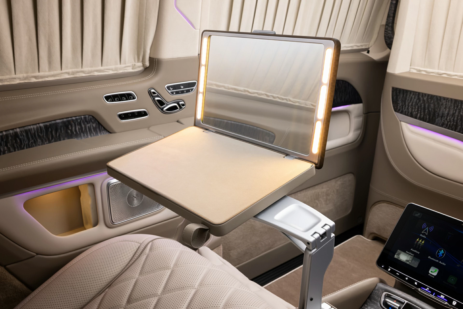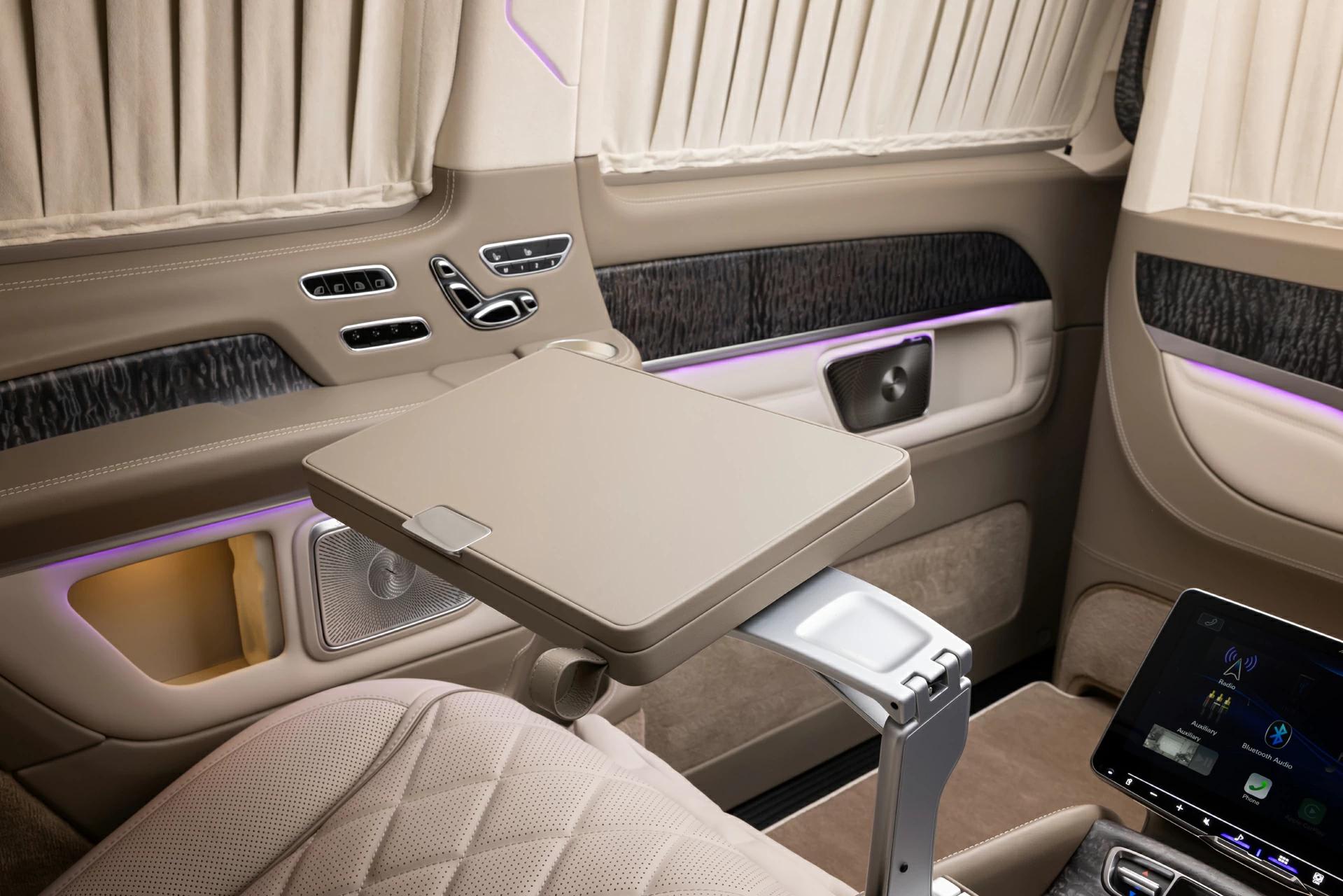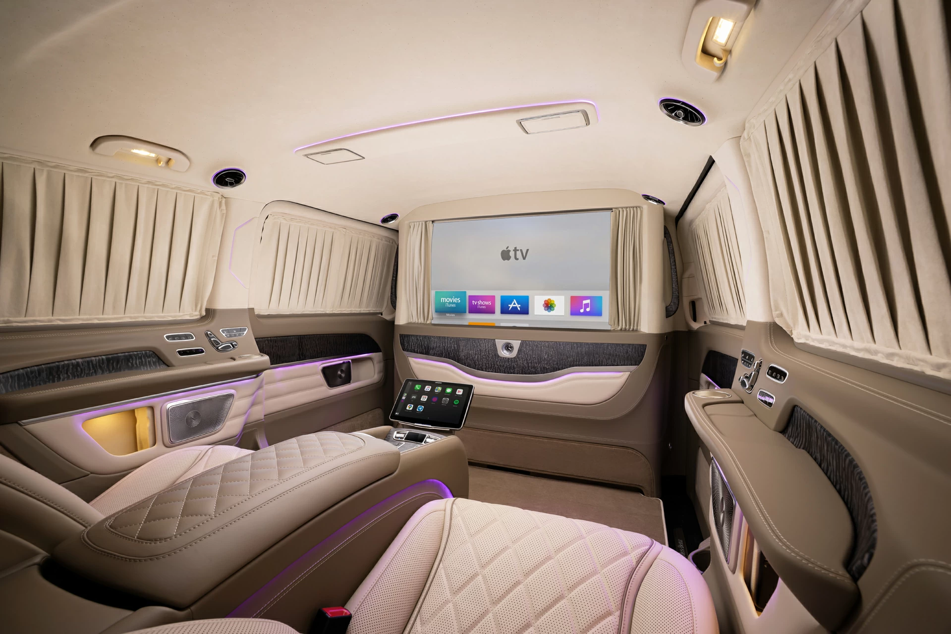 Раздельный посадочный узел с креслами Mercedes-Maybach обеспечивает максимальный комфорт при длительных поездках, а каждая деталь — от декоративных вставок до контурной подсветки — продумана с учётом эстетики и функциональности. V-BusinessJet — не просто эксклюзивный интерьер для микроавтобуса. Это статусное пространство, где каждая поездка превращается в опыт премиального уровня.
