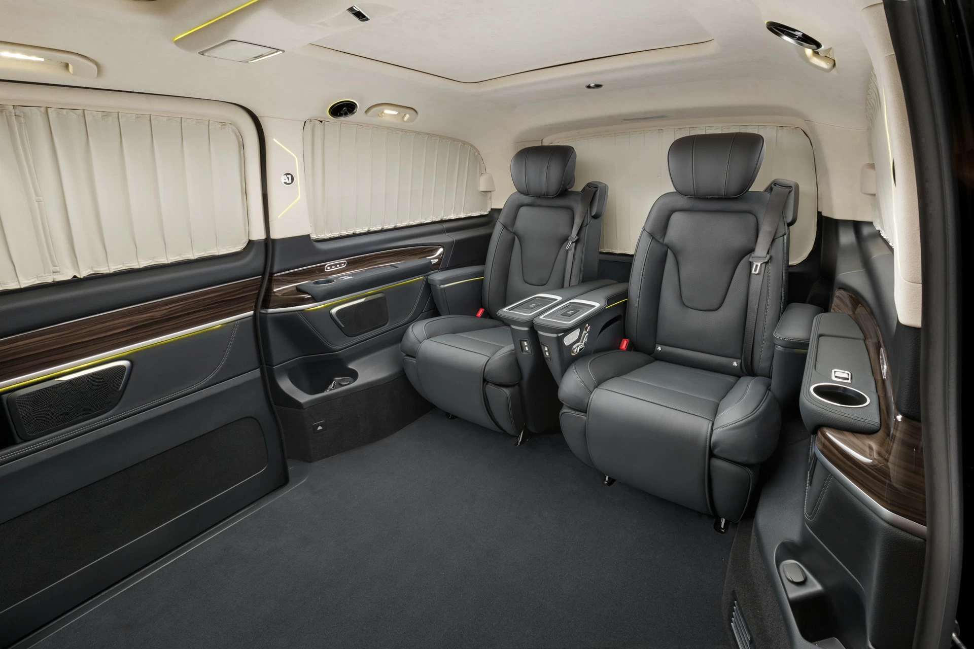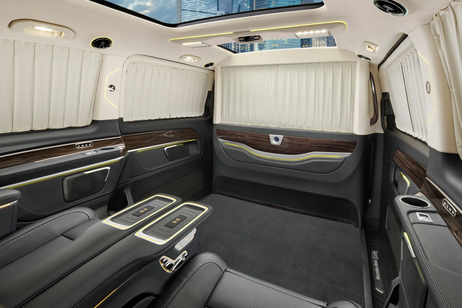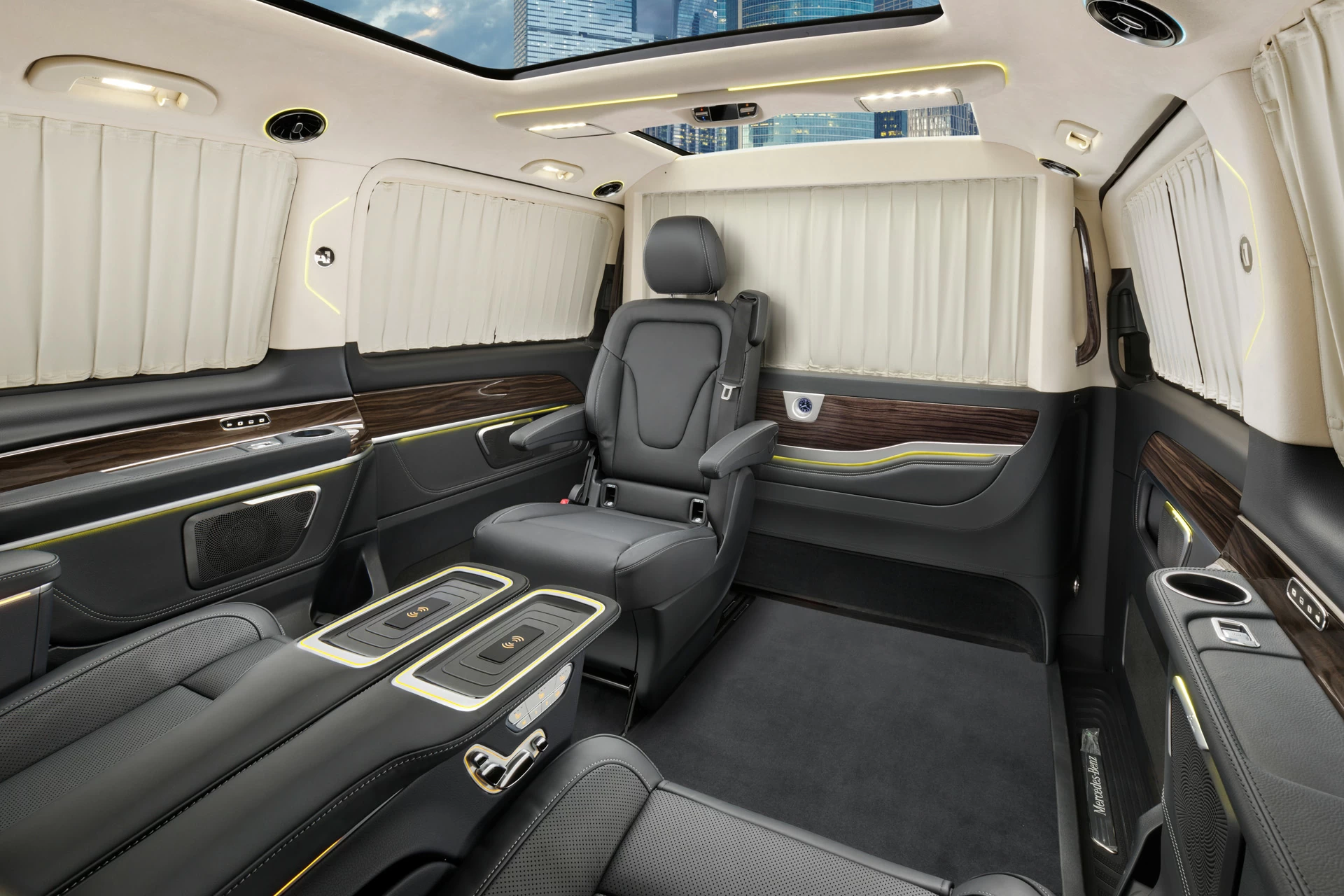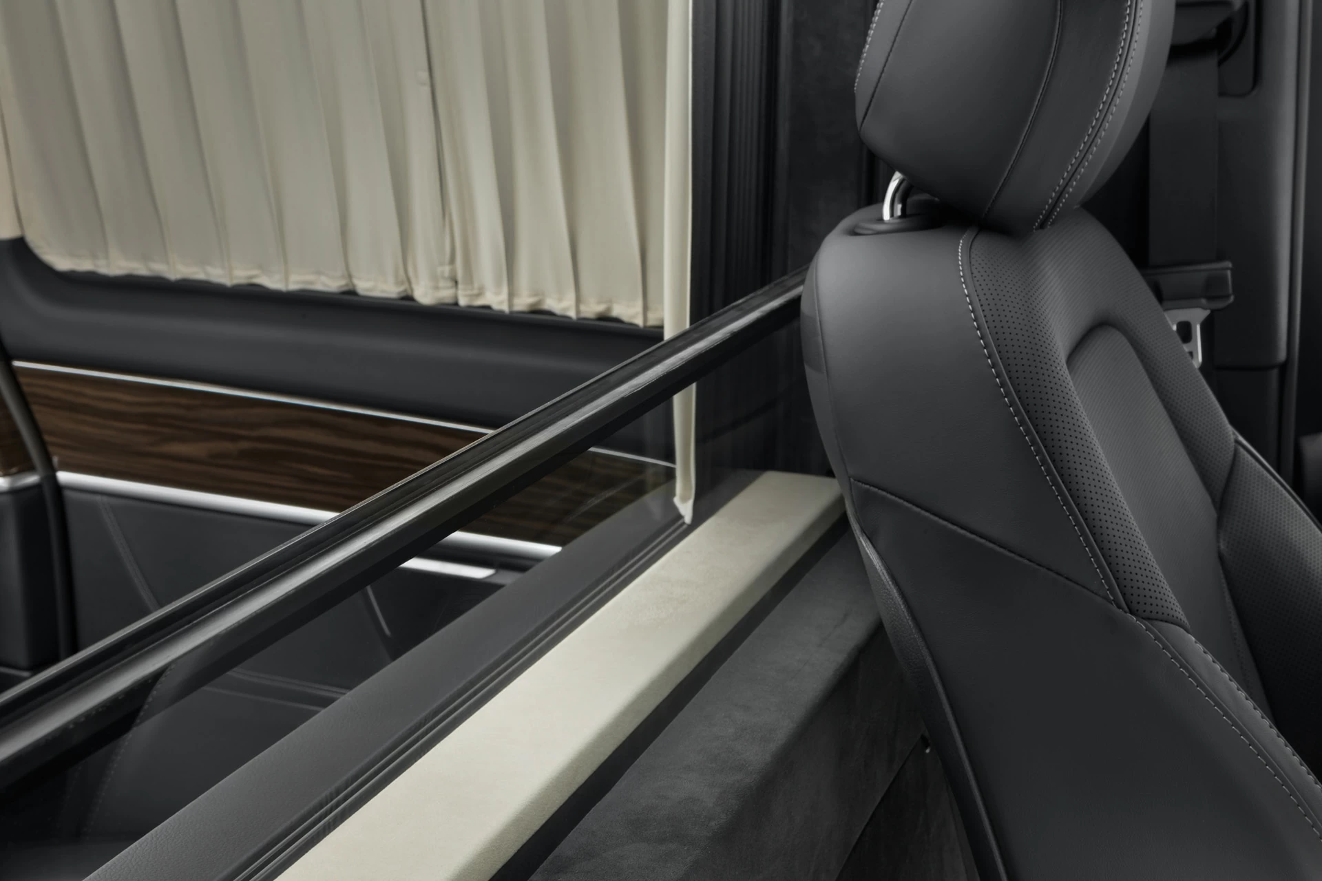 Mercedes-Benz V-Class 300D V-BusinessJet — строгий и функциональный интерьер для работы и комфорта. Комплектация V-BusinessJet от А1 АВТО в этом проекте реализована в двухцветном исполнении: светлый верх визуально расширяет пространство, а черная кожа в нижней части интерьера подчёркивает строгость и практичность. Такой баланс делает интерьер идеальным решением для деловых поездок и мобильной работы.