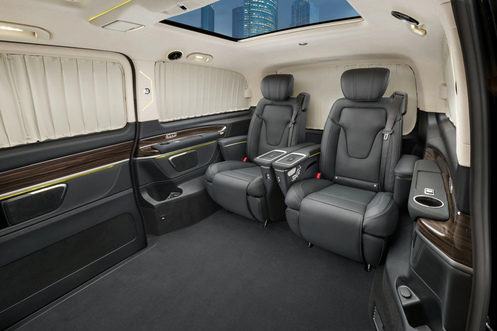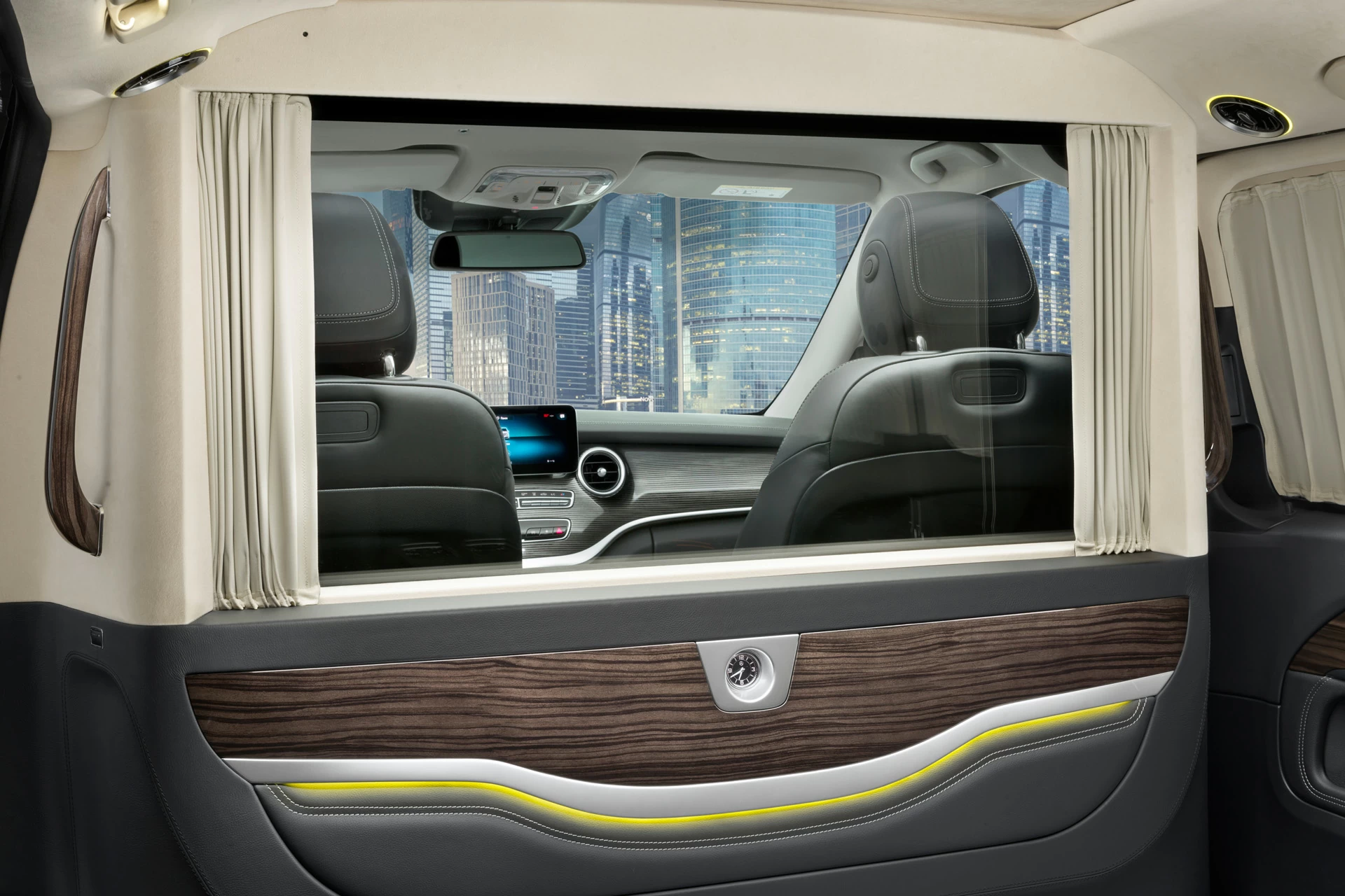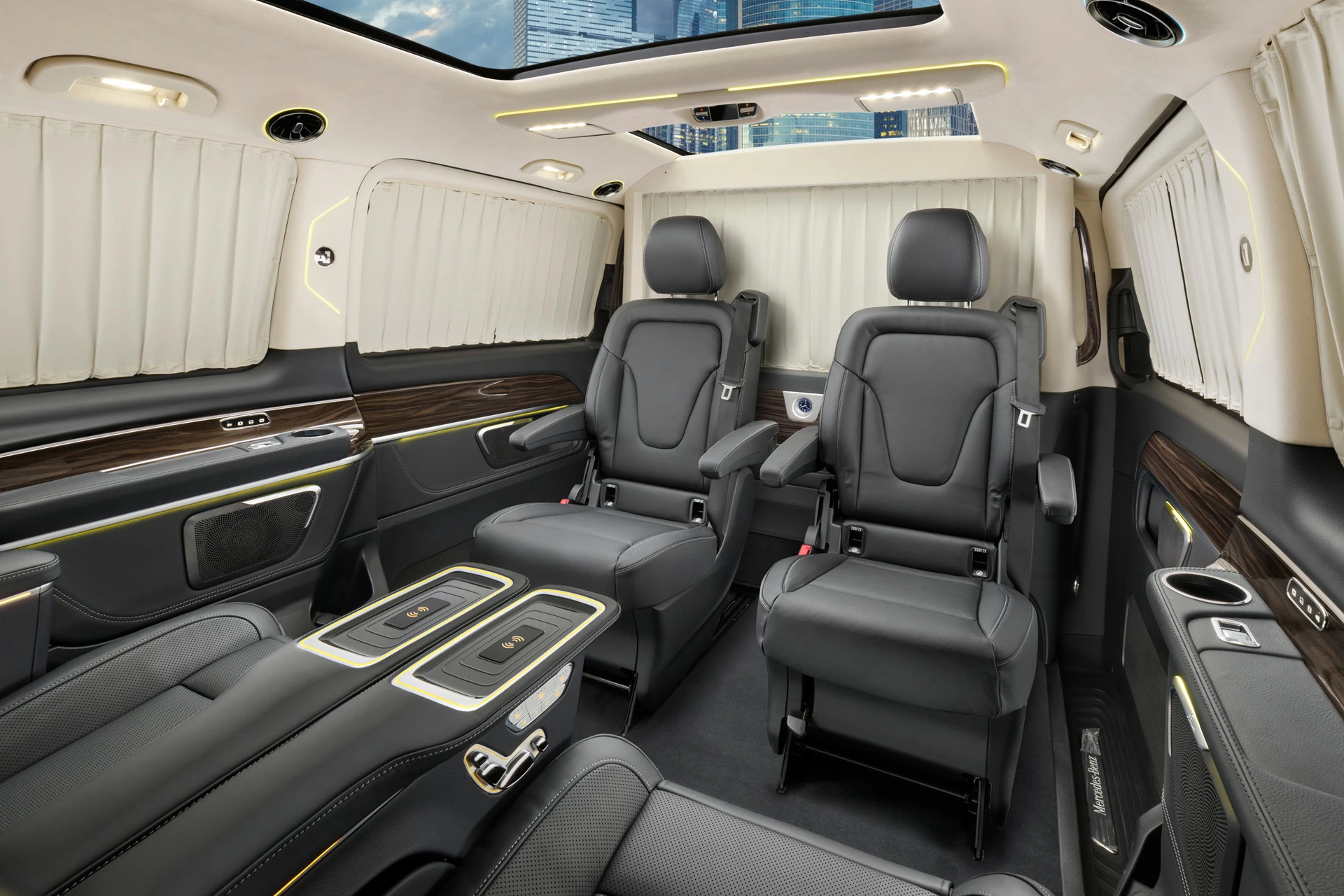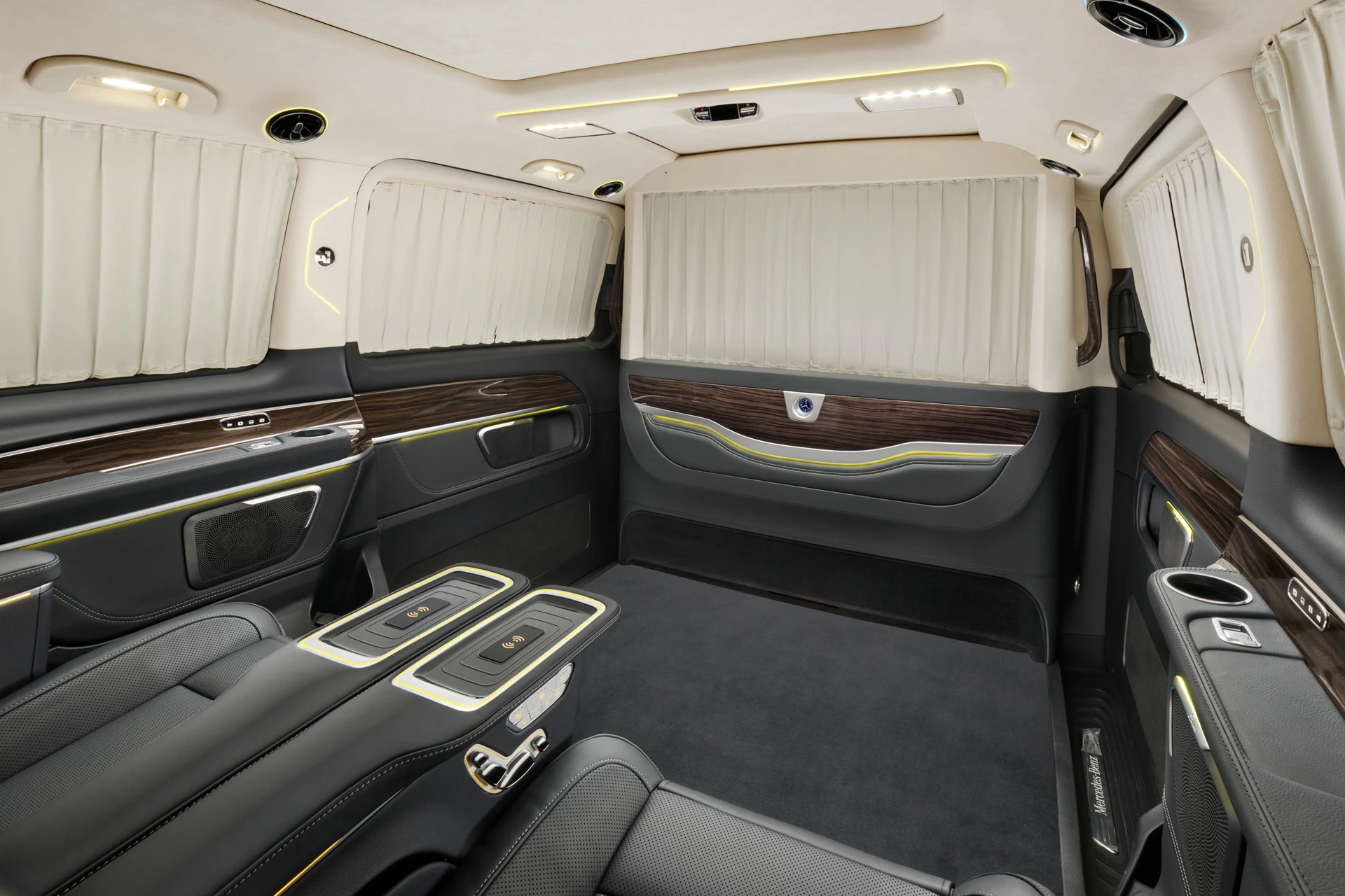 Mercedes-Benz V-Class 300D V-BusinessJet — строгий и функциональный интерьер для работы и комфорта. Комплектация V-BusinessJet от А1 АВТО в этом проекте реализована в двухцветном исполнении: светлый верх визуально расширяет пространство, а черная кожа в нижней части интерьера подчёркивает строгость и практичность. Такой баланс делает интерьер идеальным решением для деловых поездок и мобильной работы.
