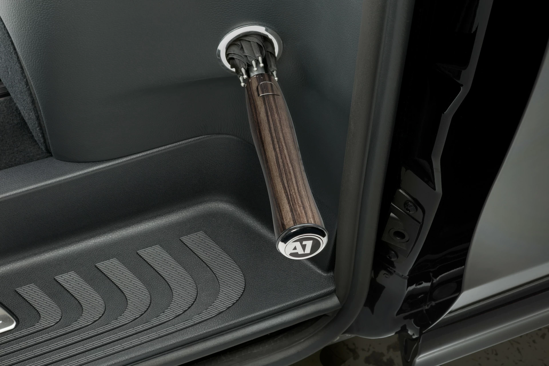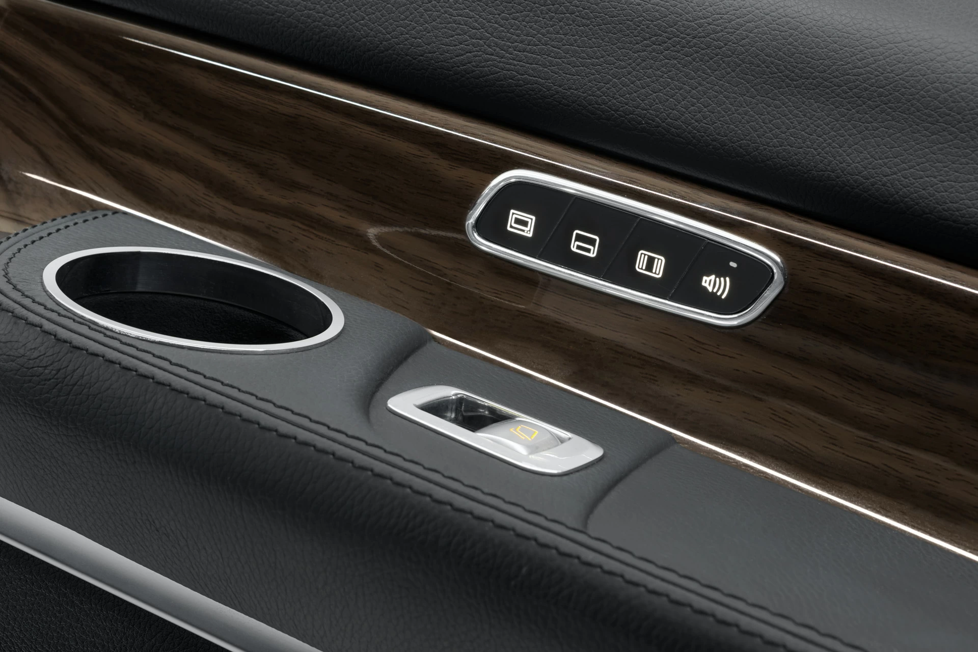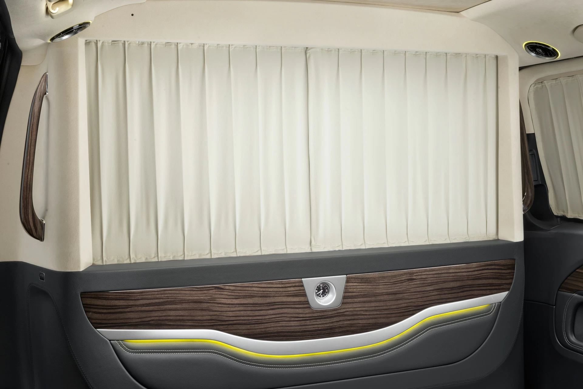 В салоне установлены капитанские кресла с индивидуальными настройками, а также дополнительные места у межсалонной перегородки — всё продумано до мелочей для комфорта и конфиденциальности. Компоновка, материалы и световые решения создают премиальную атмосферу с акцентом на статус и деловой стиль.. Проект демонстрирует, как эксклюзивный интерьер может быть не только эстетически совершенным, но и рациональным выбором для тех, кто использует автомобиль как мобильный офис.