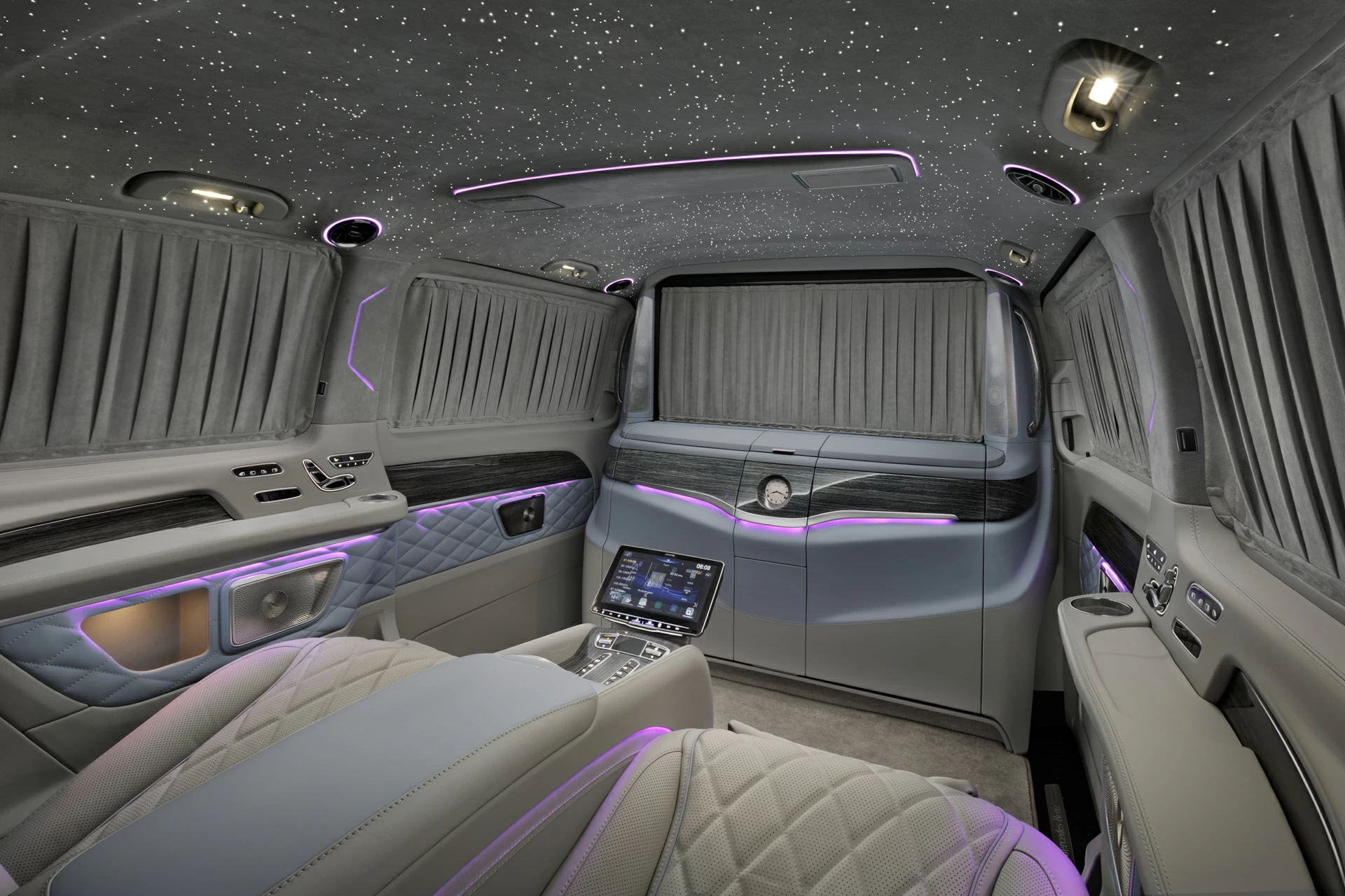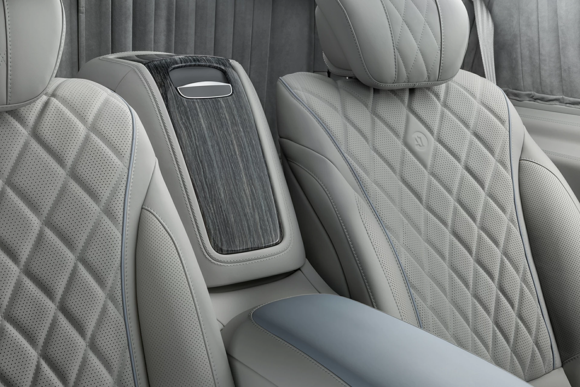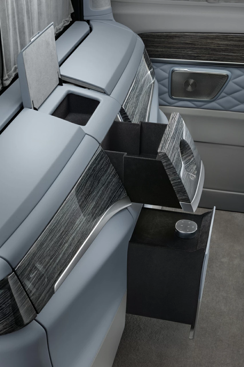 Этот проект — про тишину, комфорт и внимание к каждой детали. Комплектация V-VIP от А1 АВТО создавалась не для вау-эффекта — она про зрелую эстетику, в которой всё подчинено ощущению внутреннего покоя. Серо-голубой оттенок кожи стал сердцем интерьера: он не доминирует, не бросается в глаза — он окружает, создаёт обволакивающее ощущение мягкой среды, где всё под контролем. Внутри — капитанские кресла, межсалонная перегородка, фирменный узел в стиле Maybach, потолок с системой "звёздное небо", который особенно красиво смотрится именно в тандеме с холодными тонами интерьера.