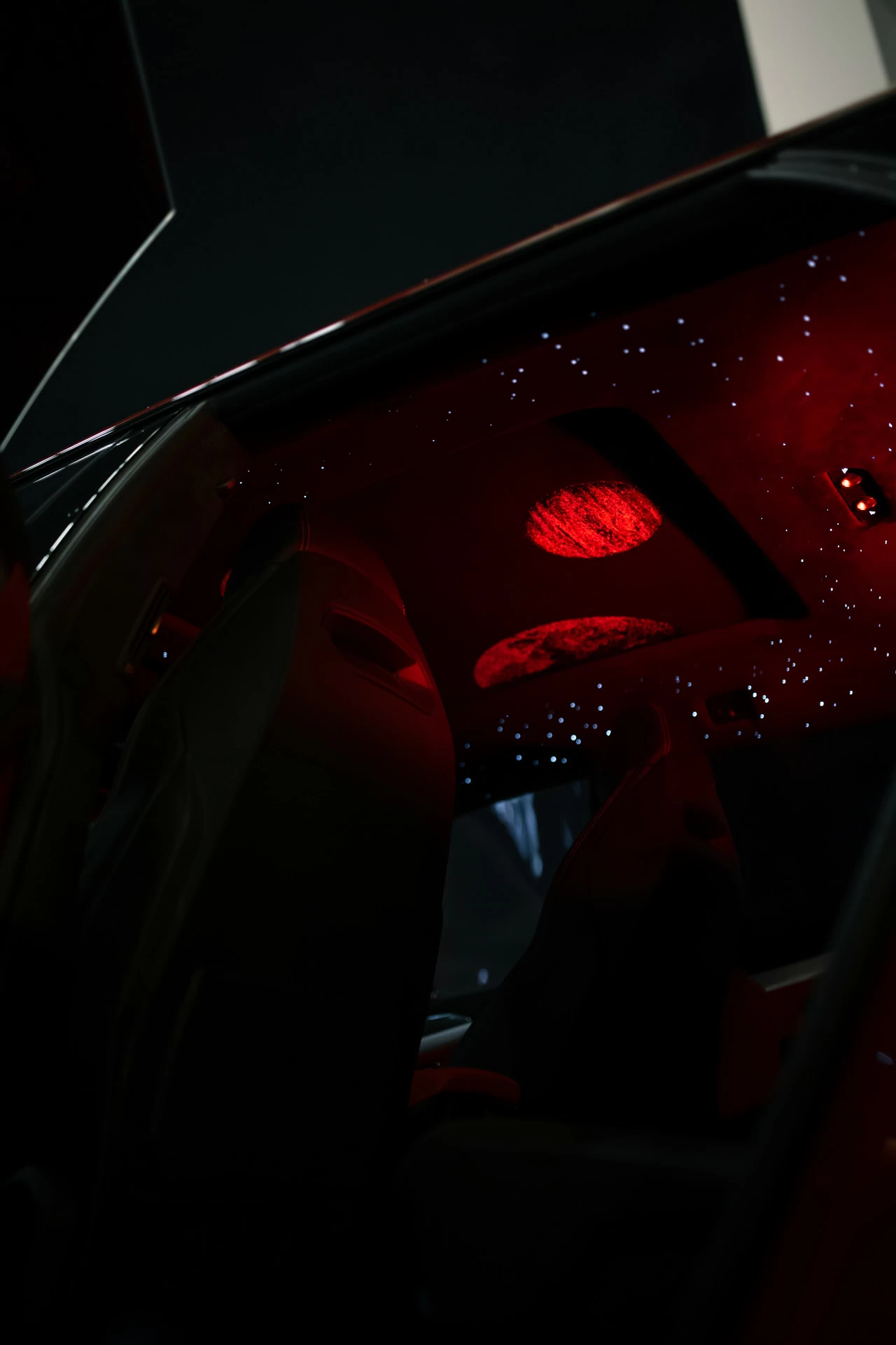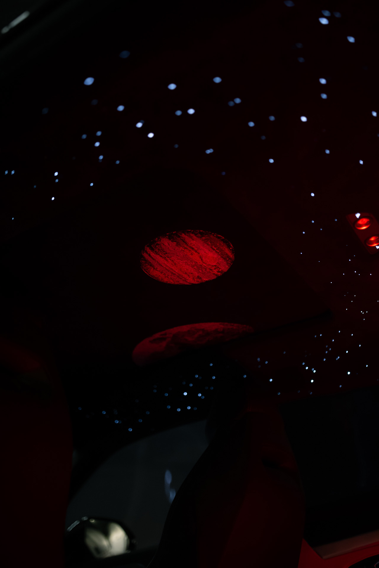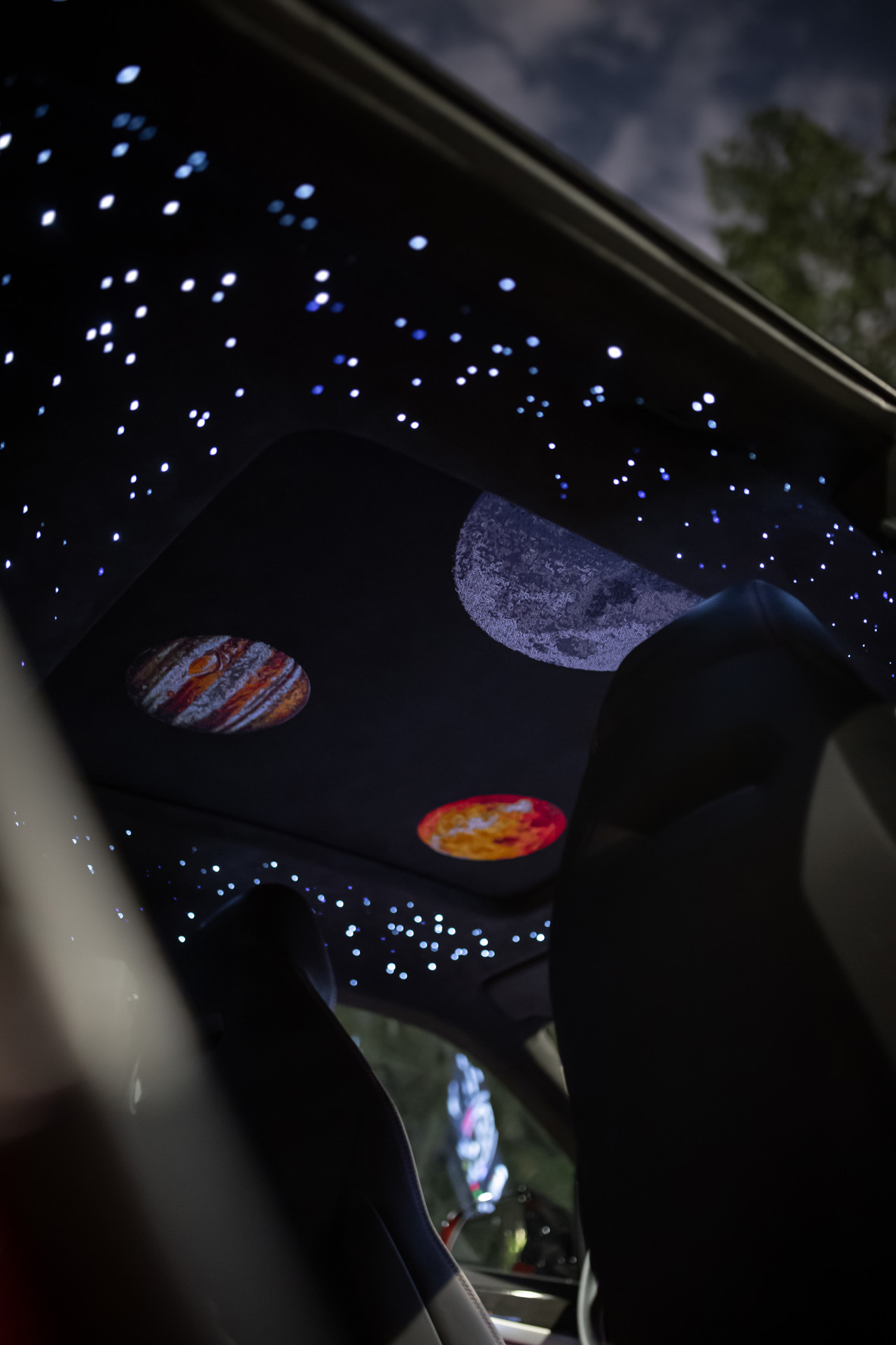 Мы установили уникальную оптоволоконную подсветку с эффектами звёзд, движущихся комет и планет. Визуальная глубина, динамика свечения и идеальная интеграция в потолок позволили сохранить эстетический баланс агрессивного супер-SUV и премиального салона.